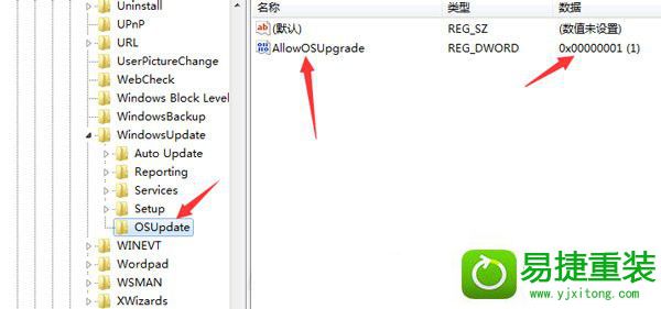 没有这个项的话就创建一个,然后在右侧空白区域右键单击,新建dwoRd (32-bit)值,并命名为“AllowosUpgrade”,再将值改为“1”。