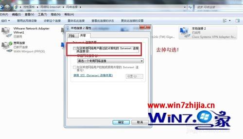 2、接下来需要点击 "Cisco systems Vpn Adapter 本地连接", 选择共享(Tab),去掉/禁用 internet 连接共享中的 “允许其它网络用户通过此计算机的 internet 连接来连接项;