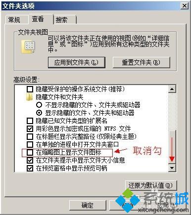 另外,如果你想在中等图片、平铺及内容视图下也可以预览的话,请重复第二步,找到:在略缩图上显示文件图片,并把前面的复选取消;