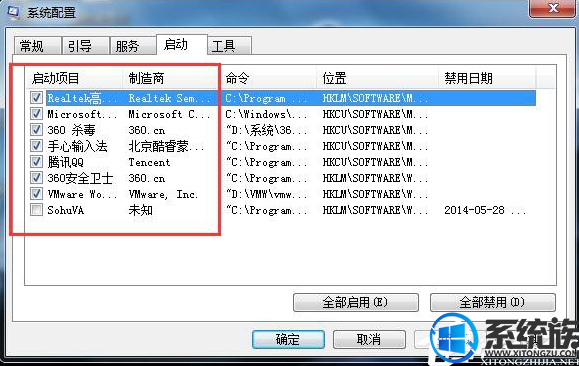 5.启动里面,你们将开机不自动运行的程序前面对勾取消,这样可以避免许多程序开机自动运行,从而开机以后,就自动在你们电脑后台运行,占用Cpuxiazaima。