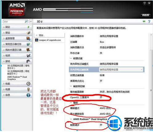 4、按照下图进行配置(openGL三重缓冲--开、镶嵌模式--AMd优化、最大镶嵌级别--AMd优化、帧数调节--开),点击应用;