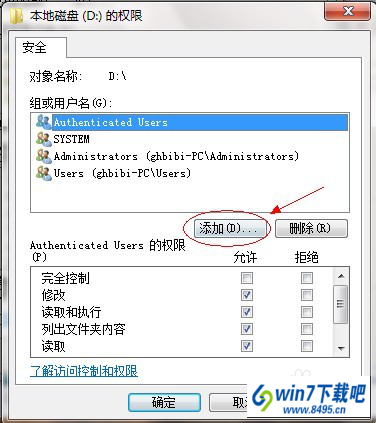 4:观察下图 “组或用户名”下面应该有个everyone 的用户,如果没有,点击“添加”添加该用户,下面的everyone的权限如图设置即可。